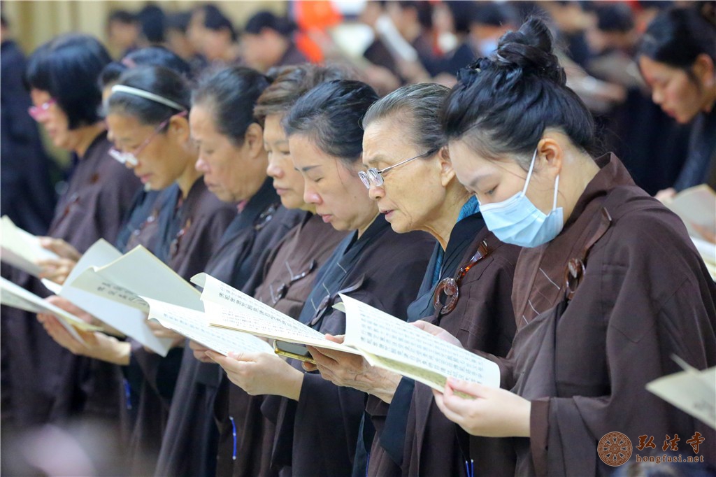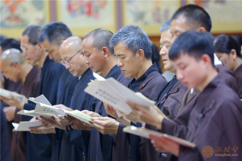 上午八时许,依照法会仪轨,大众云集经堂,威仪具足,两序大众唱赞、礼佛、拈香、洒净、持咒、诵《盂兰盆经》等,祈愿以此功德回向现世父母身体健康、延年益寿、吉祥如意,历劫父母宗亲离苦得乐、莲品增上。
